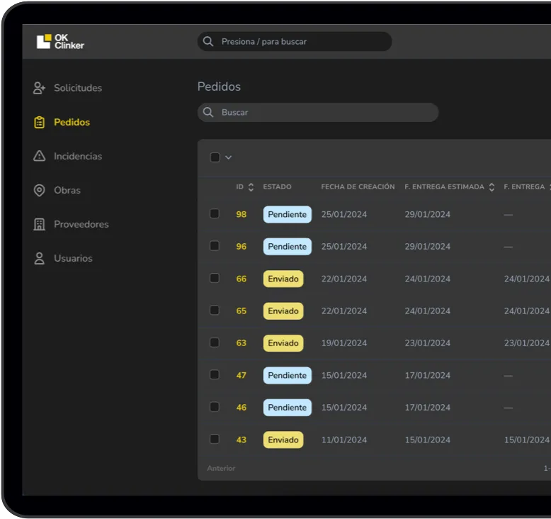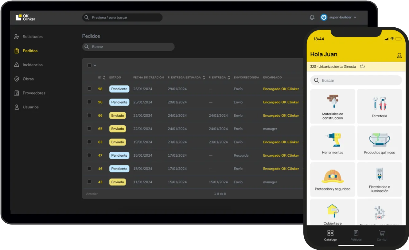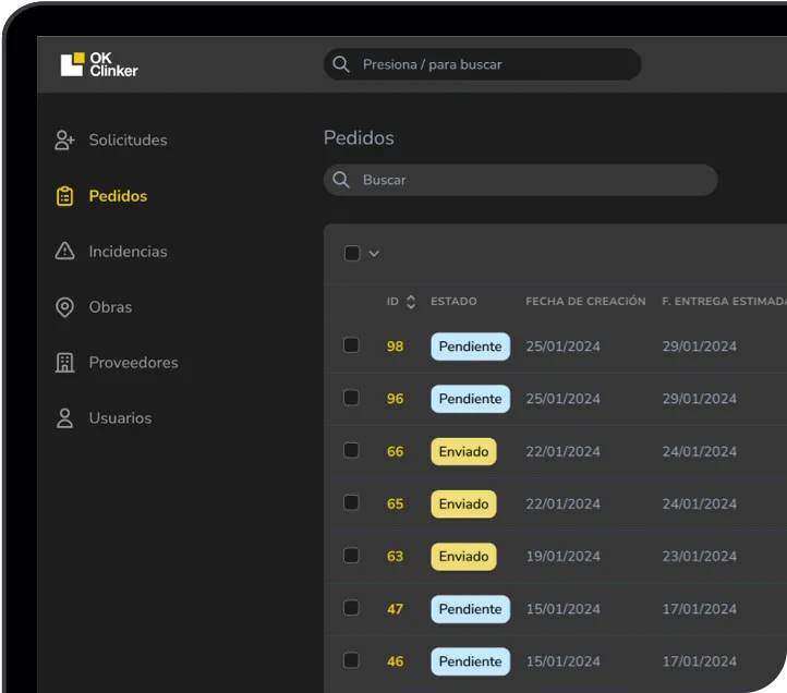 Con más de 15 años de experiencia en el sector, OK Clinker conoce las necesidades del mercado y ofrece una herramienta simple y transparente para mejorar la comunicación entre proveedores y constructoras, evitando errores en los pedidos y facilitando la gestión diaria de las obras.